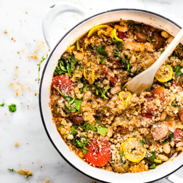 Quick sausage cassoulet topped with English muffin breadcrumbs! This easy one-pot meal is a gluten-free recipe to feed a crowd! A lightened up quick version of