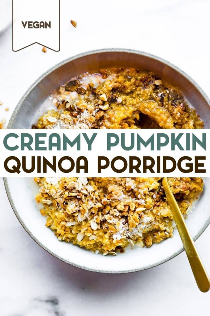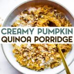 A creamy, nourishing quinoa breakfast porridge made with pumpkin puree, warm spices, and coconut milk. Gluten-free, dairy-free, and perfect for fall!