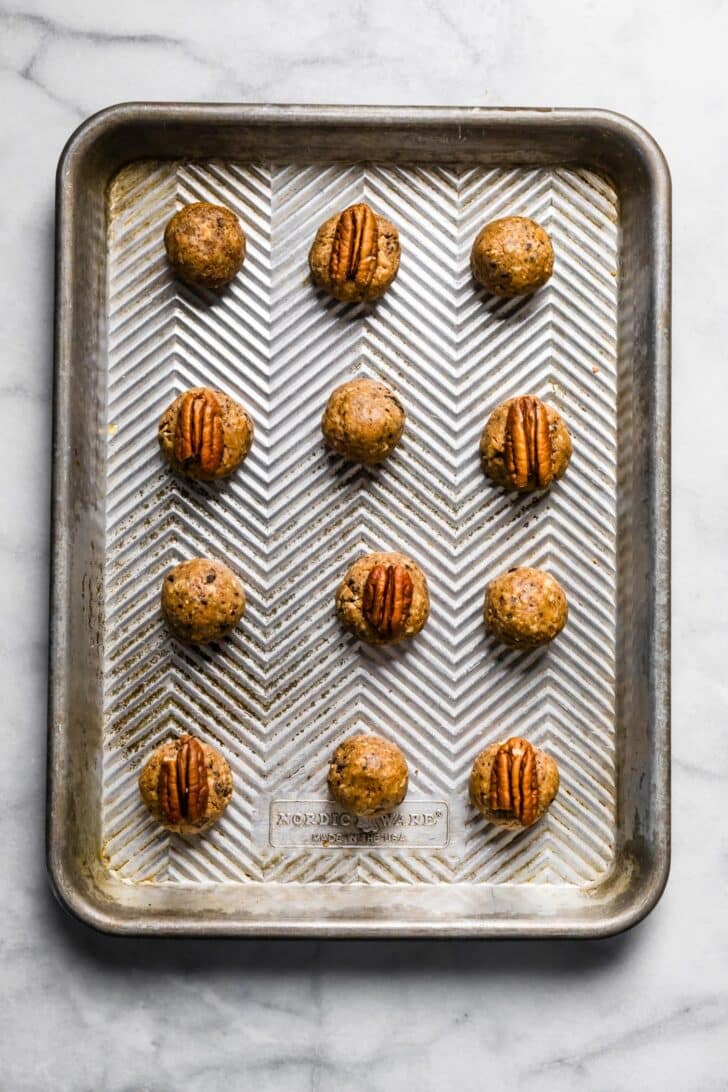 - Once chilled, Portion the batter into bite-sized balls using your hands (about 1 to 1.5 tablespoons each). For a more festive look, press a pecan half gently into the top of each ball. *See notes for chocolate dip version.
