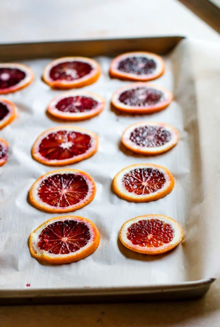 - Wash and dry oranges, then cut into very thin slices (as thin as possible). Lay them flat on a baking sheet with parchment paper.