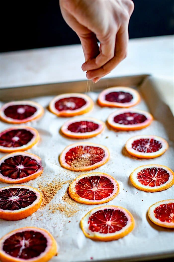 - In a small bowl, mix your spices and sugar. Sprinkle evenly over orange slices.