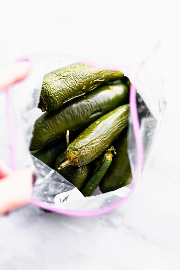 - Seal in zip top or paper bag for a few minutes to loosen skin. Then remove skin and slice the jalapenos. Remove seeds if desired.