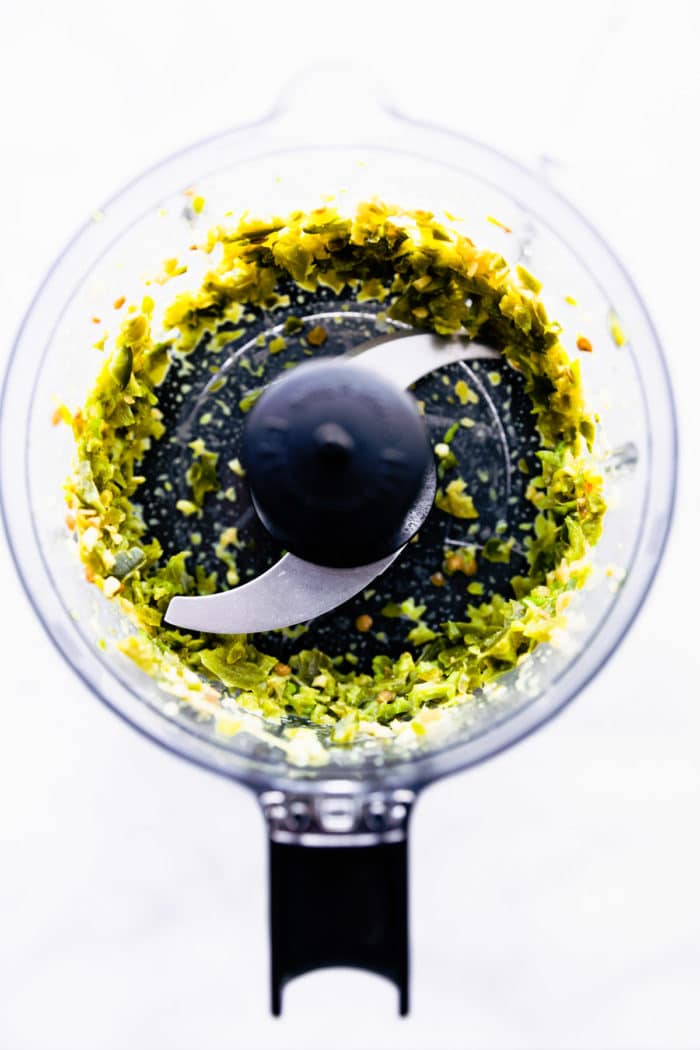 Pro Tip: After roasting, slip them into a zip top or paper bag and seal it up for a few minutes to make the skin easier to remove. Finely dice or use a food processor to blend the roasted jalapenos.